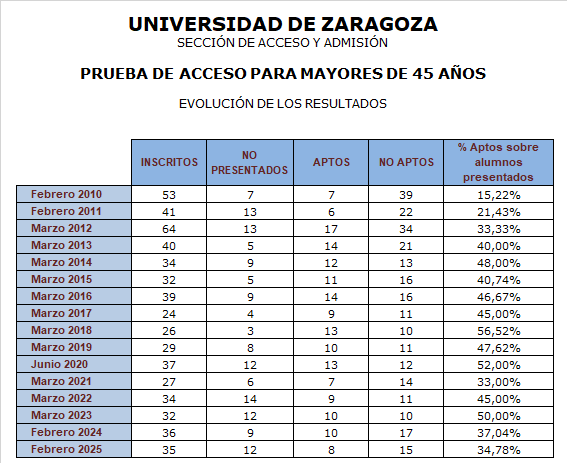 Estadística prueba de acceso para personas mayores de 45 años Última modificación Mié , 21/01/2026 - 09:43 Evolución de resultados Fuente: Tablas Paunet Descargar fichero: