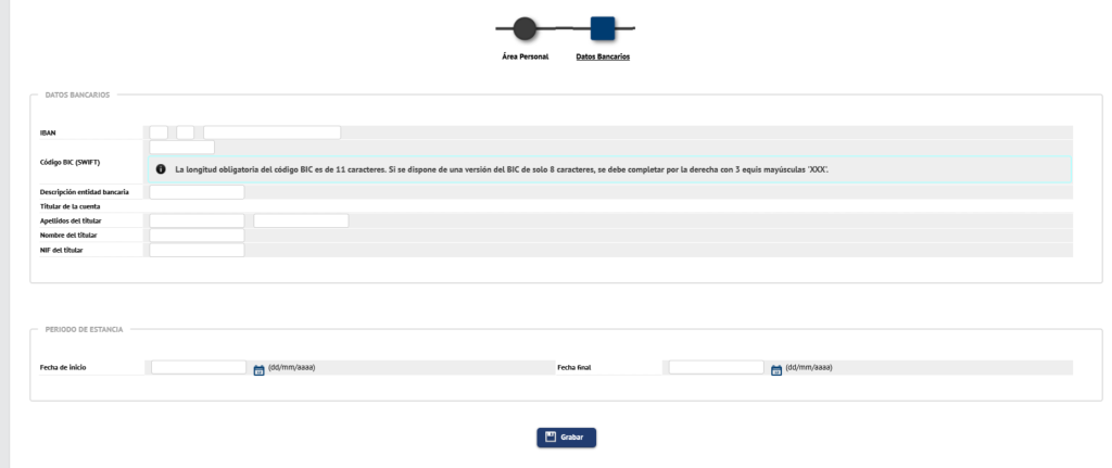 Desde la página de Área personal, ir al apartado Datos Bancarios y período de estancia y haga clic en el icono Modificar.