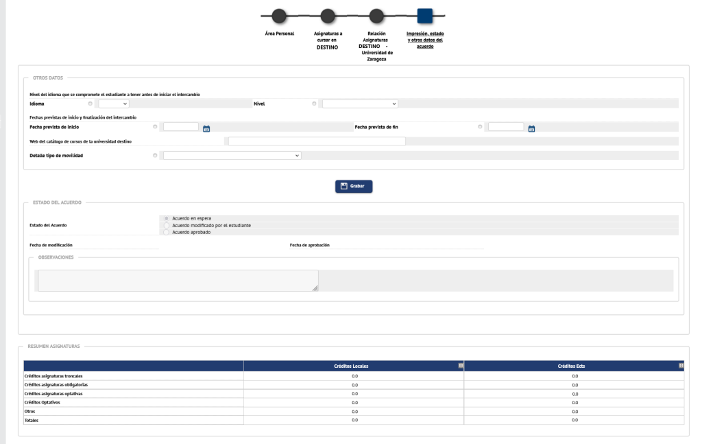 En la pantalla que aparecerá, puede comprobar el Estado del Acuerdo: Acuerdo en espera. Además,debe informar el idioma y nivel del mismo, que es el requerido en el acuerdo interinstitucional. También tiene que informar las fechas previstas de inicio y fin del intercambio, y, si la conoce y no sale informada por defecto, la web del catálogo de estudios de la universidad de destino. Una vez completados estos datos, pulse el botón de grabar.