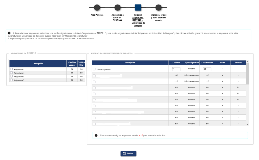 Una vez introducidos estos datos, pulse el botón Grabar. Repita estos pasos para cada una de las asignaturas a cursar fuera, de forma que se vayan incorporando a la relación: