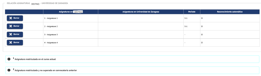 2. Eliminar o modificar una o varias asignaturas extranjera. En la pestaña Asignaturas a cursar en... [Universidad de destino] puede eliminar o modificar la asignatura o asignaturas de la universidad extranjera, cambiando el título de la asignatura, el código, el periodo en el que se imparte o los créditos. Solo las asignaturas que no están relacionadas tienen el botón de Borrar o Modificar.