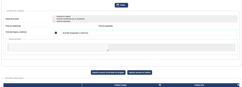 Una vez que el Coordinador los haya autorizado, pasará al estado Acuerdo aprobado. A partir de entonces, si regresa a esta pantalla encontrará que ya tiene los botones Imprimir acuerdo UZA e Imprimir acuerdo uni destino y podrá imprimir el Acuerdo, a efectos informativos, porque carece de validez si no está firmado.